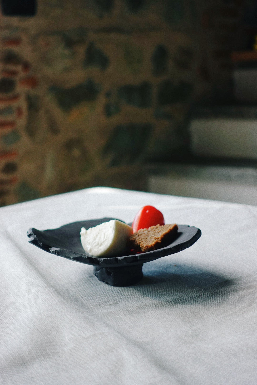 Its deep matte black finish enhances the organic surface, creating a strong yet understated presence. Perfect for serving small bites, displaying fruit, or elevating everyday rituals into quiet, intentional gestures.