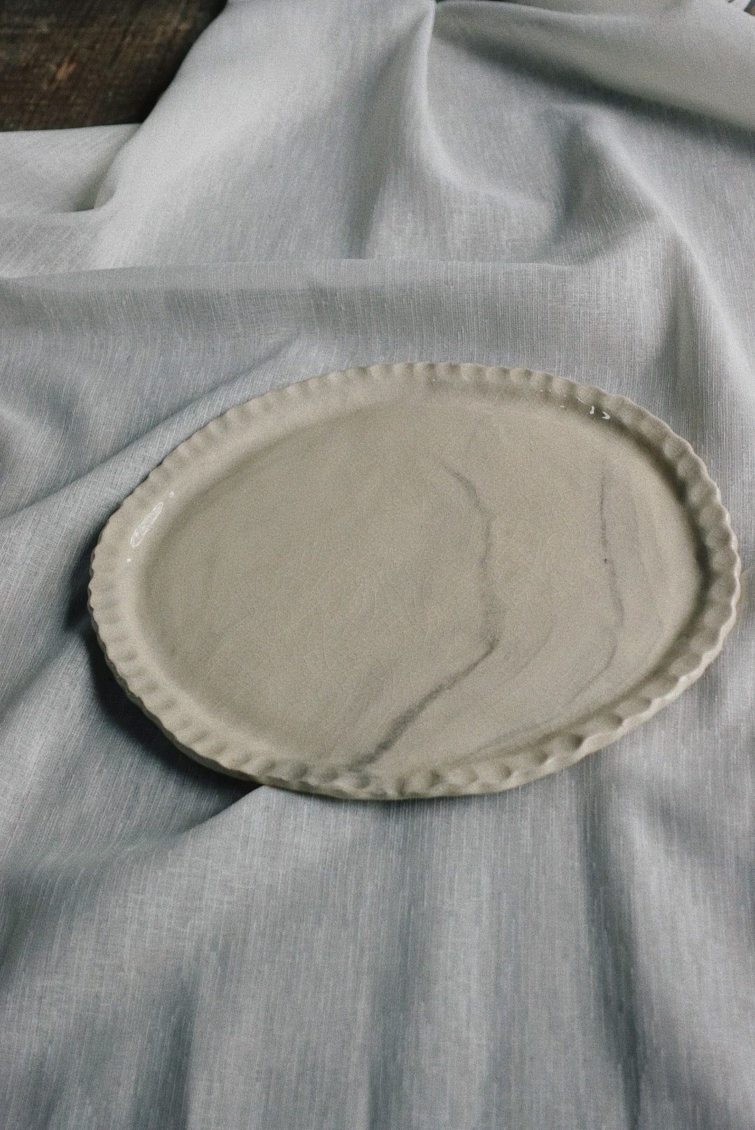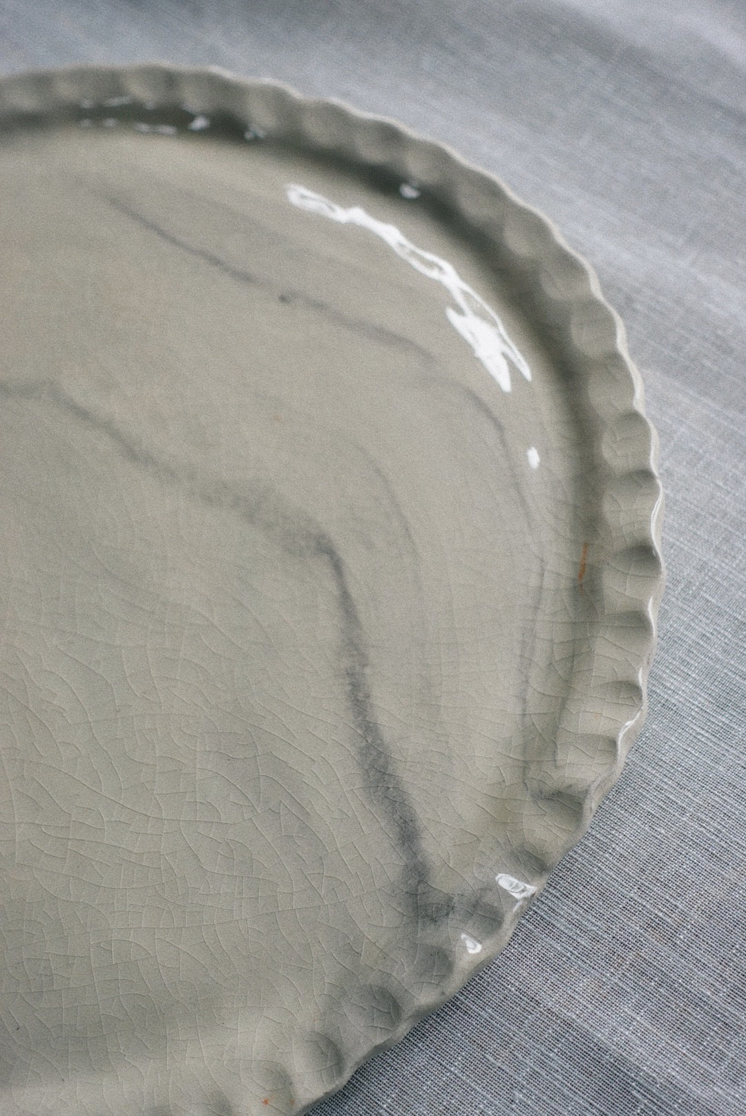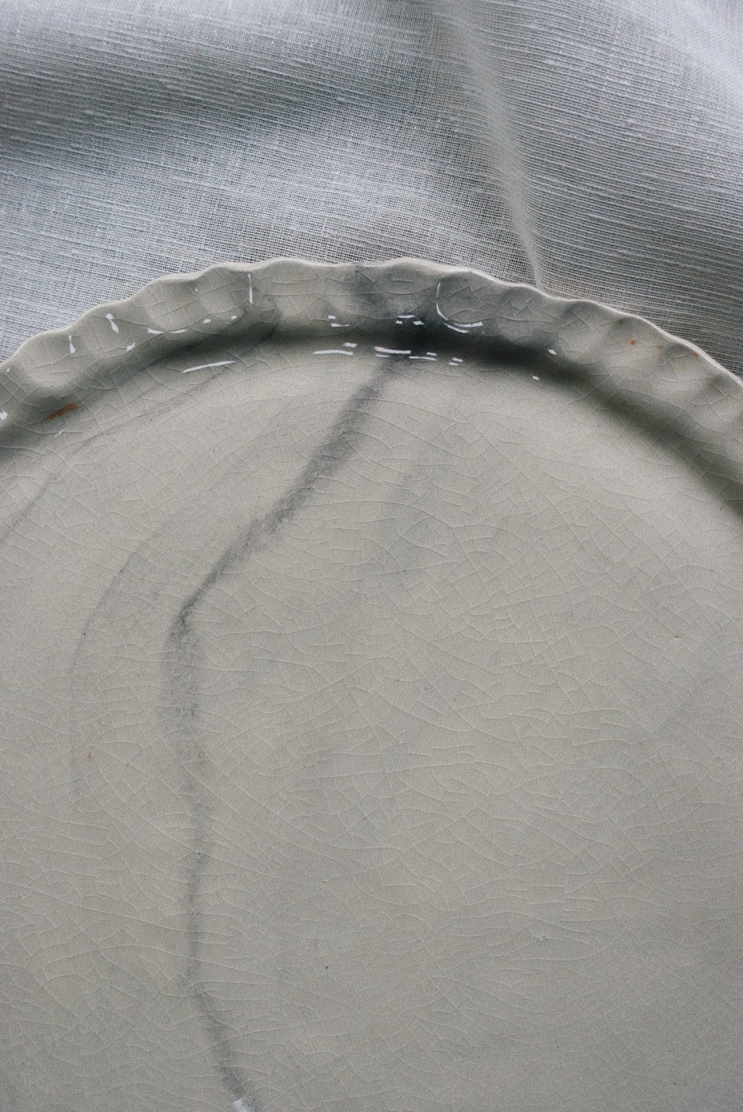 Big plate perfect to serve food as tray or as decorative element. It’s made of white gres and black clay glazed with craquelè glaze.